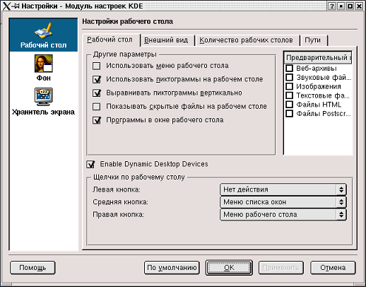 Оконный интерфейс ОС Linux состоит из двух частей: Рабочего стола (возможно использование сразу нескольких Рабочих столов) и панели KDE (похожа на панель задач в ОС Windows). На панели KDE размещаются: главное меню «K», набор ярлыков для быстрого запуска программ, переключатель между рабочими столами, часы и прочее. Для настройки Рабочего стола необходимо щелкнуть правой кнопкой мыши по Рабочему столу и в появившемся меню выбрать пункт «Настроить Рабочий стол…» Настройка Рабочего стола состоит из трех пунктов: рабочий стол, фон и хранитель экрана. Пункт «Хранитель экрана» позволяет выбрать и настроить экранную заставку. Пункт «Фон» служит для выбора и настройки фонового рисунка Рабочего стола. Рассмотрим подробнее пункт «Рабочий стол». ![]() Пользователю предоставляется ряд закладок: