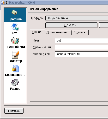 В состав Linux входит стандартный почтовый клиент KMail (подобно тому, как Outlook Express поставляется вместе с Windows). Запустить KMail можно через меню KDE > Интернет > KMail. Прежде, чем работать с почтой необходимо провести ряд настроек на почтовый сервер. Для этого в меню «Настройка» выбираем пункт «Настроить KMail...». ![]() На вкладке «Профиль» можно создать один или несколько профилей. Для каждого профиля настройки сохраняются отдельно. Это удобно при работе с несколькими почтовыми ящиками. В поле «Адрес email» желательно указать адрес своего ящика, хотя возможно и любое другое значение. Этот адрес автоматически будет отправляться с письмами в разделе «От», и получатель сможет по нему ответить на пришедшие письма. Если указать галочку «Добавлять подпись», то к любому отправляемому письму в конце будет добавляться указанный текст. Помимо непосредственного ввода подписи можно указать файл, из которого будет браться текст или командный файл для динамического формирования подписи. На вкладке «Сеть» осуществляются настройки параметров почтового сервера. Для отправки и получения писем установки делаются в отдельности, что позволяет использовать разные сервера при отправки и получении соответственно. Параметры настроек несколько отличаются. Поэтому рассмотрим их в отдельности.